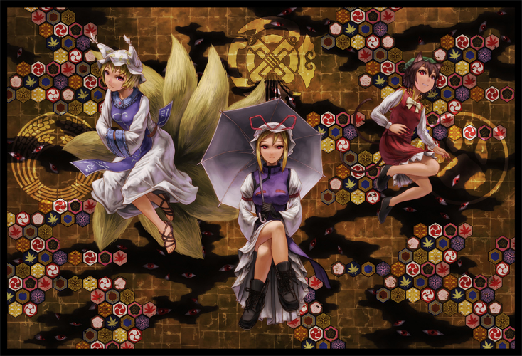 キャラの脇にある円形の模様も藍様の脇にあるのは稲荷紋、ゆかりんの上にあるのは祇園守紋、という日本の家紋です。それぞれ稲荷大社、八雲神社の神紋になってるものです。